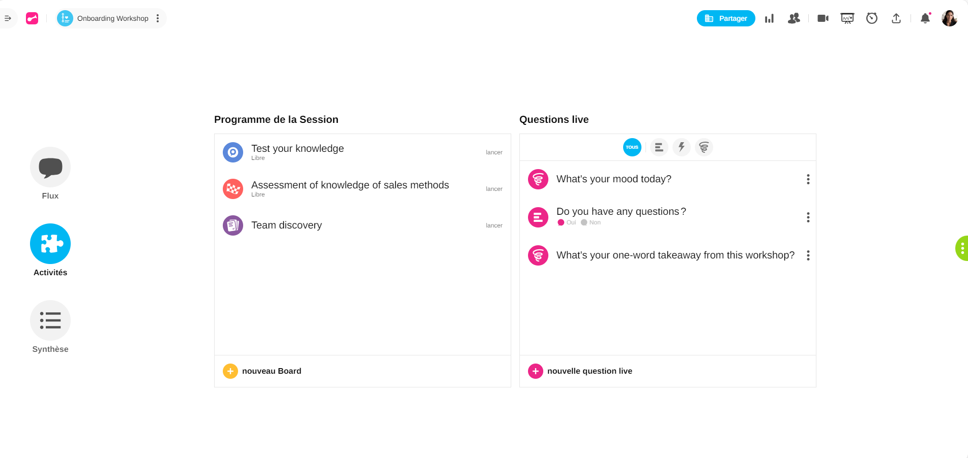 Vous préparez ou animez une Session et souhaitez ajouter un Board, cliquez sur "Activités" situé sur le volet de gauche.