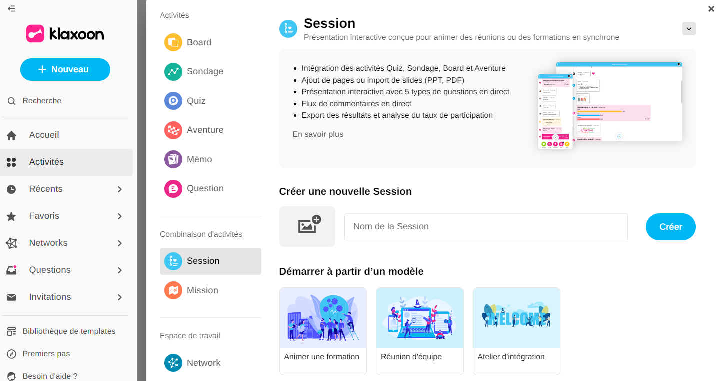 Le mode "Contrôlé par l'animateur" (disponible qu'à partir de la session) est une fonctionnalité puissante de Klaxoon qui vous permet de contrôler le rythme de vos activités. Cela signifie que vous pouvez lancer et arrêter les activités à votre guise, ce qui vous donne plus de contrôle sur le déroulement de votre Session.