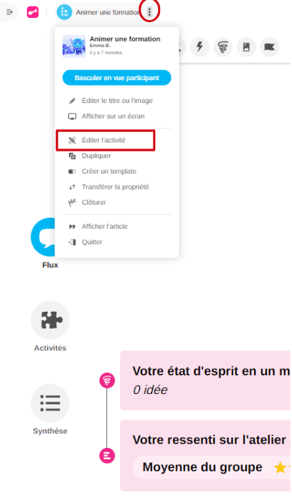 Depuis votre Session, cliquez sur le menu « 3 points » en haut à gauche, puis sur « Editer l'activité ».