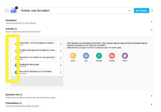 💡Il est recommandé de modifier l'ordre des activités avant la session pour éviter les interruptions pendant la présentation.