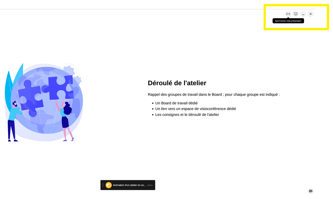 En cliquant sur "Synchroniser cette présentation", vous allez pouvoir partager votre présentation sur tous les écrans des participants.