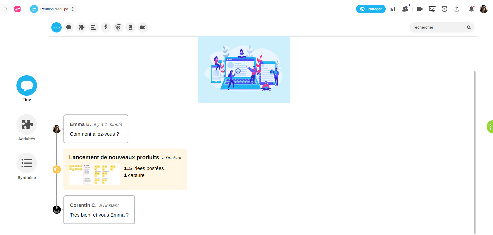 Pendant une session, les participants et l'animateur peuvent interagir en envoyant des messages instantanés, qui sont affichés publiquement sur le tableau de l'écran principal :