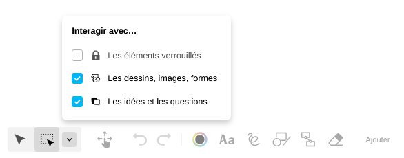 « Options d’Interaction », en bas à gauche du Board, pour choisir « Les idées et... » de pouvoir placer eux-mêmes leurs idées sur le Board et d’agir en conséquence.