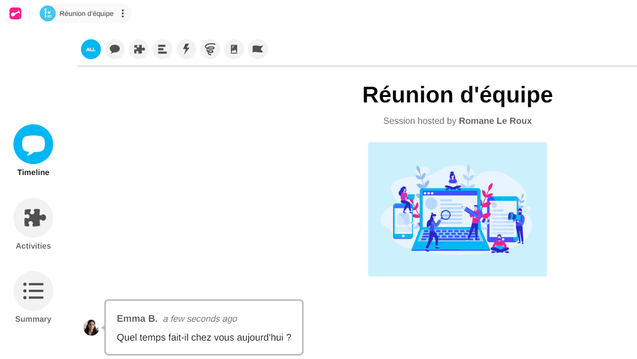 Les boutons situés au-dessus du Flux dans une Session sont des outils essentiels pour filtrer et organiser les informations partagées.