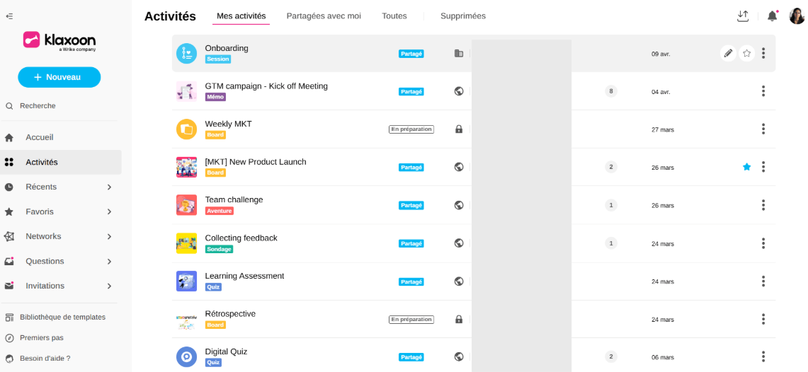 Depuis votre page d’accueil Klaxoon, cliquez sur Mes activités.