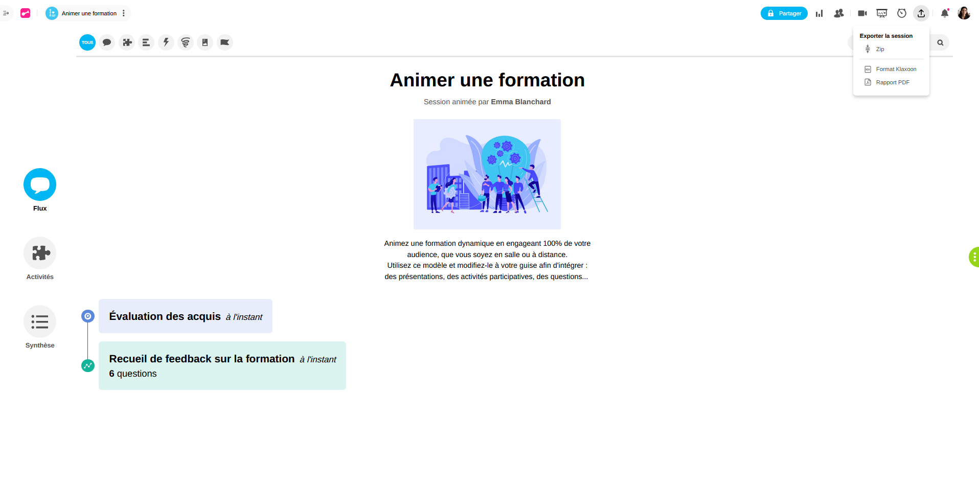 2 - Format Klaxoon : si vous souhaitez partager la structure de la Session avec l’un de vos collègues. Jetez un coup d’œil à cet article : Importer des activités pour découvrir comment l’utiliser.