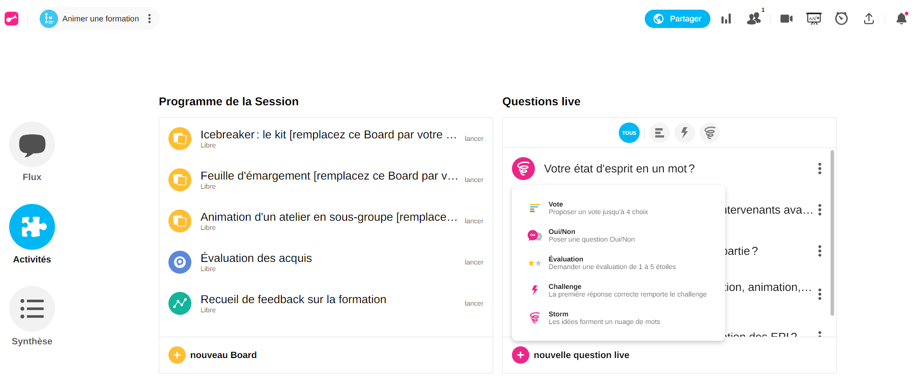 Elles peuvent être préparées depuis l'onglet "Questions Live" lors de la création d'une session ou ajoutées, si nécessaire, à l'aide de l'interface de l'animateur.