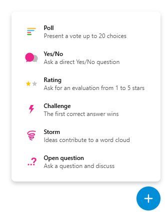 Les questions en direct peuvent être préparées dans vos activités lors de la création d'une réunion ou ajoutées, si nécessaire, à l'aide du tableau de bord.