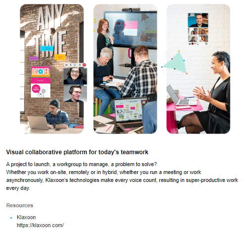 La section "Lien des ressources" dans Klaxoon est un atout précieux pour enrichir vos sessions. Elle vous permet d'intégrer des liens URL vers des pages web, offrant ainsi un accès direct à des informations complémentaires pour vos participants.