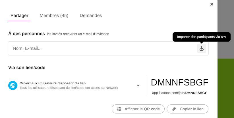 En envoyant un email d'invitation, ce qui implique soit de saisir les adresses électroniques manuellement, soit d'importer un fichier CSV (feuille de calcul Excel) - cette option permet au créateur du réseau de ne donner accès qu'aux personnes qui ont été spécifiquement invitées.