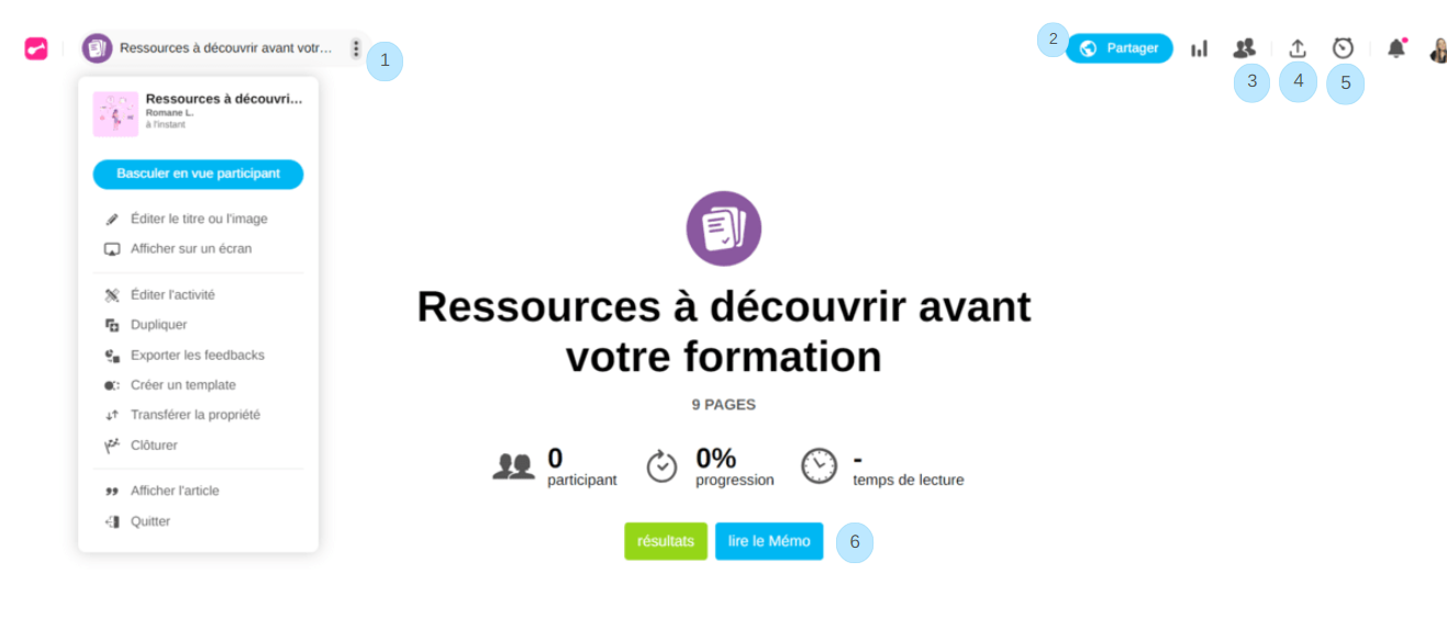 Accède aux pages Mémo et aux résultats des questions du quiz et de l'enquête, quel que soit l'état d'avancement des participants.