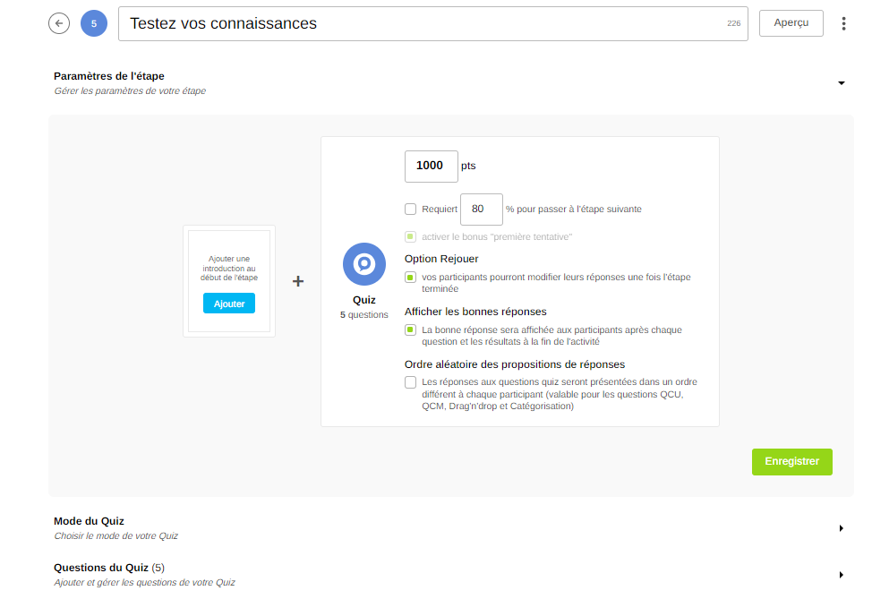 Score requis (Quiz uniquement) : les participants doivent atteindre le score spécifié pour passer à l'étape suivante.