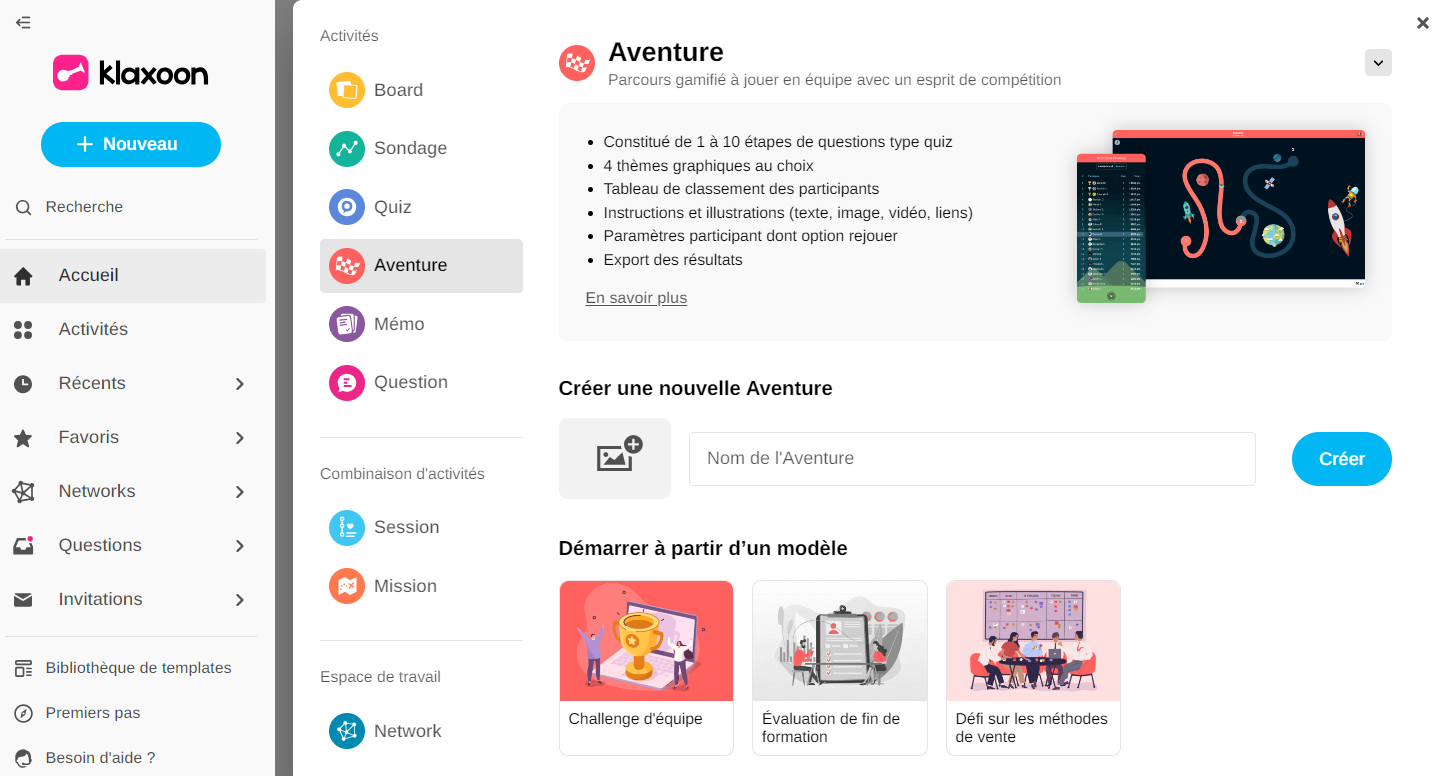 Depuis votre page d'accueil, cliquez sur « Nouveau», puis sur « Aventure ».