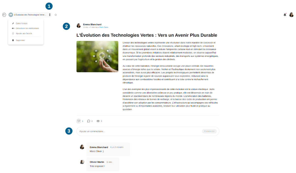Édition/Suppression : un menu d’options apparaît au survol du commentaire, permettant à l’auteur de le modifier ou de le supprimer