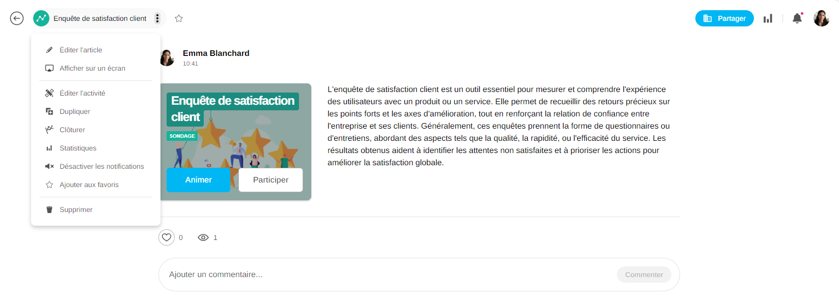 Bouton « Partager » : il permet d’accéder à l’activité via la modale de partage